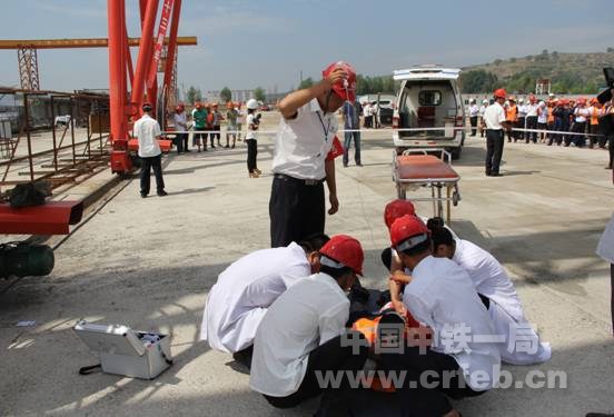 本次“安全生產月”宣傳咨詢日活動中,四公司靜靜鐵路項目部還針對施工中的高空墜落事故風險進行了應急救援預案演練。演練設安全警戒組、醫療救護組、綜合協調組、物資保障組、事故調查組,嚴格按照救援隊伍、救助車輛、救援物資應急保障要求和突發事件處置預案組織進行,從發現險情、報告報警、救援救護、疏導警戒、事故調查、處理善后,每個過程都井然有序。大約15分鐘后,通過現場應急指揮和各營救小組緊密配合,高空墜落事故應急救援演練取得了圓滿成功,充分展示了中鐵一局在事故預防和救援方面的能力。