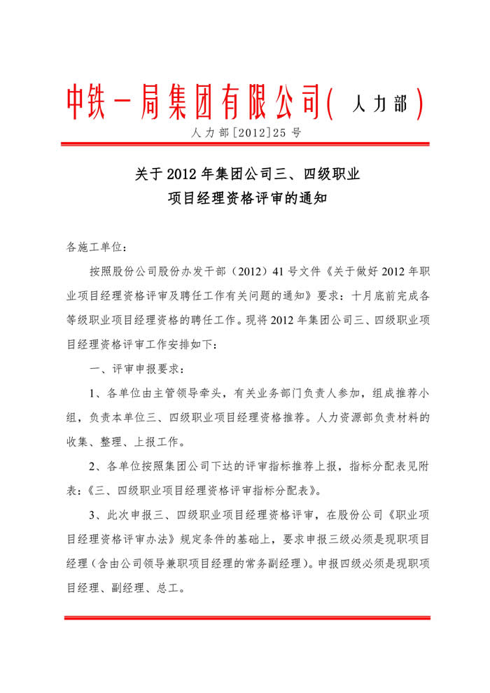 關(guān)于2012年集團(tuán)公司三、四級(jí)職業(yè)項(xiàng)目經(jīng)理資格評審的通知
