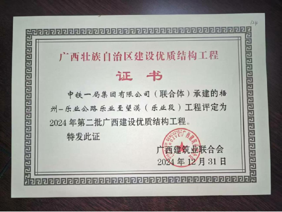 2024年12月,項目獲評廣西建設優質結構工程獎項;同月,公路預制梁智能化鋼筋加工安裝一體化施工技術等2項工法獲評全國公路、中國中鐵優秀工法;一種基于激光控制的橋梁墩柱垂直度控制儀等3項實用新型專利落地,20余項四新技術推廣應用……一項項榮譽的背后,是項目團隊的堅守與付出。