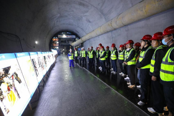 觀摩團在朱家山隧道出口觀看隧道工藝展板