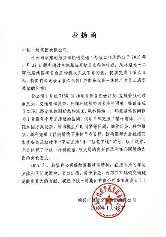 紹興軌道交通集團向中鐵一局發(fā)來表揚信