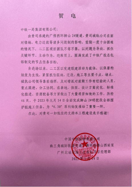 1月14日,中鐵廣投廣佛環線總包部向中鐵一局發來賀電,對中鐵一局承建的廣佛西環二工區項目團隊不等不靠、主動作為、迎難而上,圓滿完成了中鐵廣投廣佛環線總包部制定的節點任務目標給予肯定。