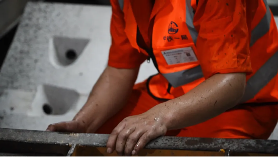 7點半左右,一聲沉悶的汽笛聲響起,電動車編組從彎道轉出,車上裝載著管片、螺栓等各類建材。電動車駛近后減速緩行,穩穩地停靠臺車前端。邱軍文主要負責管片的吊裝,從進場到開工,短短半個小時,他身上的衣服已經被汗水浸透,像剛從水里撈出來一樣。在彎腰為管片擰上吊裝用的螺栓時,一顆顆豆大的汗珠不斷從他臉上滑下,滴落在管片上又很快滲入其中。“為了順利推進地鐵建設,再苦再累也是值得的。”邱軍文說,高溫天在隧道里施工出汗量很大,需要及時補充水分,一壺1.5升的水用不了多久就喝光了。