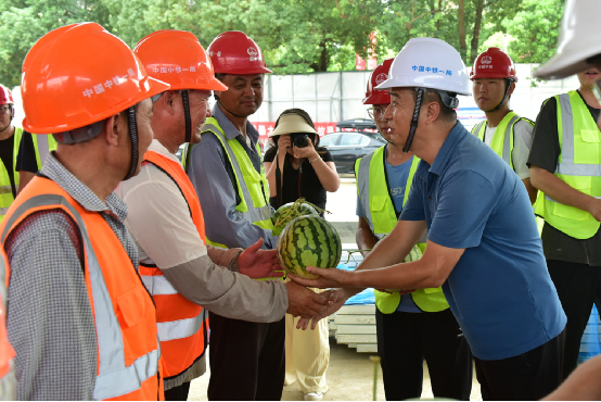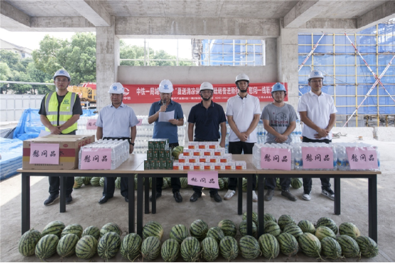 下午許,公司工會主席、總經(jīng)濟(jì)師王黨庫,無錫蘭亭四季置業(yè)公司項(xiàng)目負(fù)責(zé)人許懷洲、江蘇華城工程管理咨詢有限公司監(jiān)理總監(jiān)羅培金等共同為一線工友送去了西瓜、鹽汽水及藿香正氣水等防暑物資和藥品,叮囑大家時刻注意身體健康,做到勞逸結(jié)合,要求項(xiàng)目部眾志成城,克服高溫挑戰(zhàn),質(zhì)量和進(jìn)度要做到“高溫更高效、炙烤更炙熱”,同時還要以人為本,采取必要的措施和方法,保證職工平安度暑。
