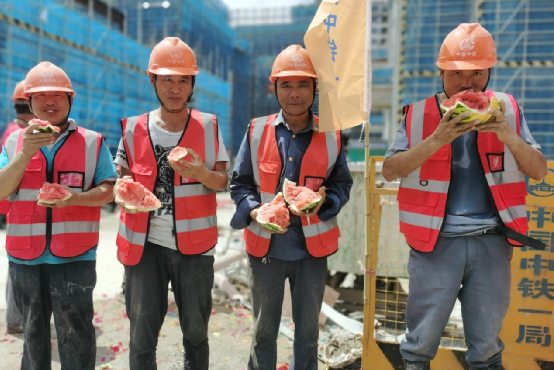 王黨庫代表公司對項目1號大樓的順利封頂表示祝賀,對為大樓頂如期封頂而頑強拼搏、艱辛付出的一線職工表示肯定和慰問,要求項目部以人為本,采取必要的措施和方法,為員工安全渡過酷暑提供保障。