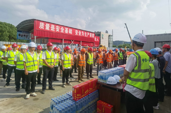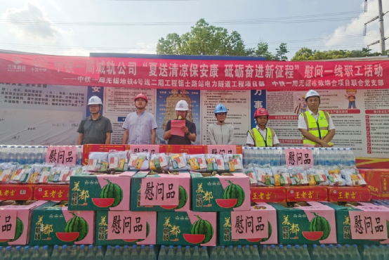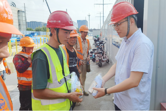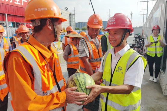 與會領(lǐng)導共同為一線作業(yè)工友送去了西瓜、鹽汽水等清涼物資及藿香正氣水、人丹等防暑禮包,將關(guān)懷送到了每個工友的手中。