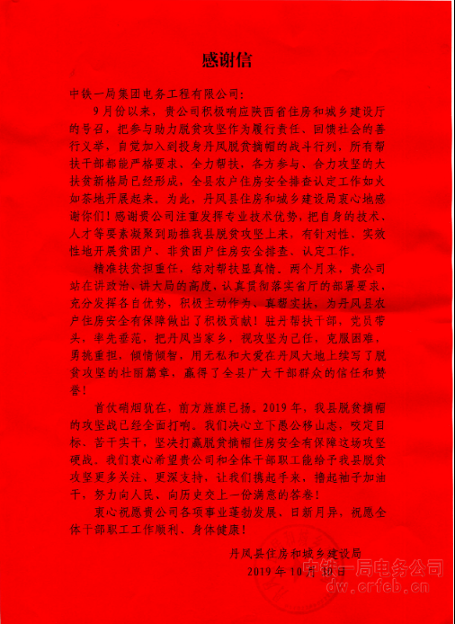 在工作結束后的座談會上,公司企劃部副部長何光榮表示:“黨中央把脫貧攻堅擺到至關重要的位置,作為央企理應走在前列,主動踐行企業社會責任。希望通過企業努力和作用發揮,助力丹鳳打贏脫貧攻堅戰。”丹鳳縣住建局以發感謝信和贈送錦旗的形式向公司的幫扶表示了感謝。