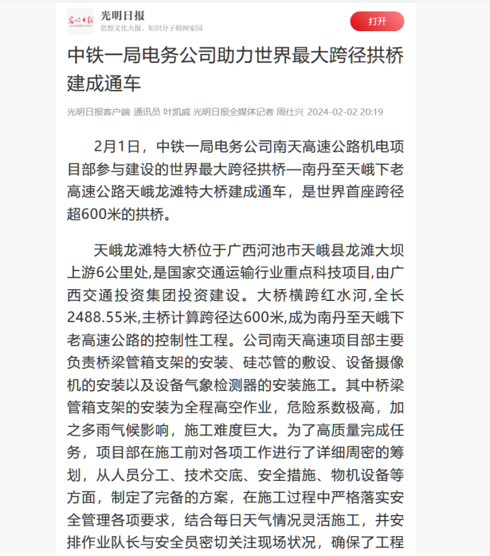 2月1日,中鐵一局電務公司南天高速公路機電項目部參與建設的世界最大跨徑拱橋—南丹至天峨下老高速公路天峨龍灘特大橋建成通車,是世界首座跨徑超600米的拱橋。