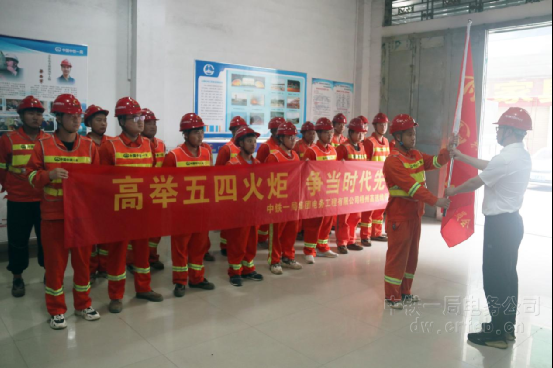 五四青年節到來之際,六分公司特意在項目上組織開展了“青年突擊隊”授旗儀式,進一步激發項目青年員工的工作激情和干勁。活動當日,六分公司安質總監朱江濤對成立“青年突擊隊”的目的與重要意義進行了簡單介紹,并向“青年突擊隊”隊長徐祥祥進行授旗。徐祥祥帶領全體隊員進行了宣誓,并代表青年突擊隊作表態發言。