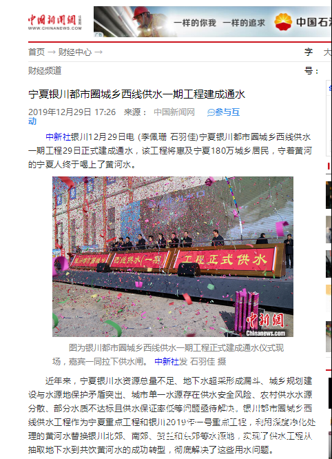 新華網報道:銀川都市圈城鄉西線供水工程項目通水