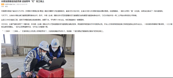 3月24日,中國青年報報道公司青年職工援建方艙醫院事跡:長春加緊建設抗疫用房 這些青年“釘”在工地上