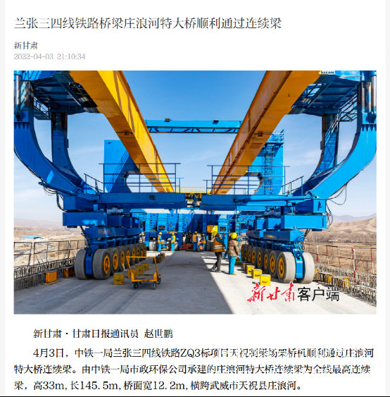 4月3日,新甘肅報道:蘭張三四線鐵路橋梁莊浪河特大橋順利通過連續(xù)梁