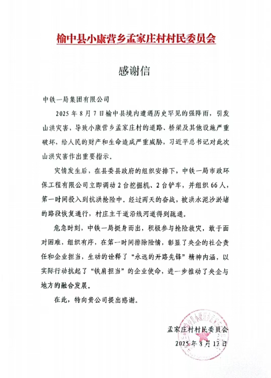 8月13日,中鐵一局市政環(huán)保公司歷經(jīng)3天的奮戰(zhàn),順利完成榆中縣小康營鄉(xiāng)孟家莊村的道路清淤,公司承接的榆中縣搶險救災第一階段道路搶通任務也宣告完成。孟家莊村村民委員會特贈送錦旗并發(fā)感謝信,感謝中鐵一局挺身而出,積極參與搶險救災,生動詮釋“永遠的開路先鋒”精神內(nèi)涵,扛起“鐵肩擔當”的企業(yè)使命。